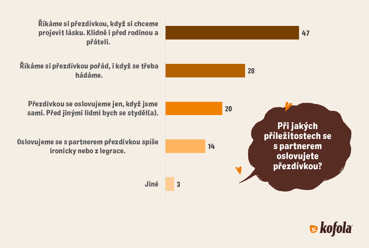 Více než 80 % oslovených nijak nevadí, když si před nimi cizí lidé říkají přezdívkami. Však za lásku se nikdo stydět nemusí. A to i přesto, že přezdívky, které dotazovaní uváděli v průzkumu, ne vždy vyzněly lichotivě, jako například Smraďoch, Ušoplesk nebo Koště. I tady však platí okřídlené „Když ji miluješ, není co řešit“.